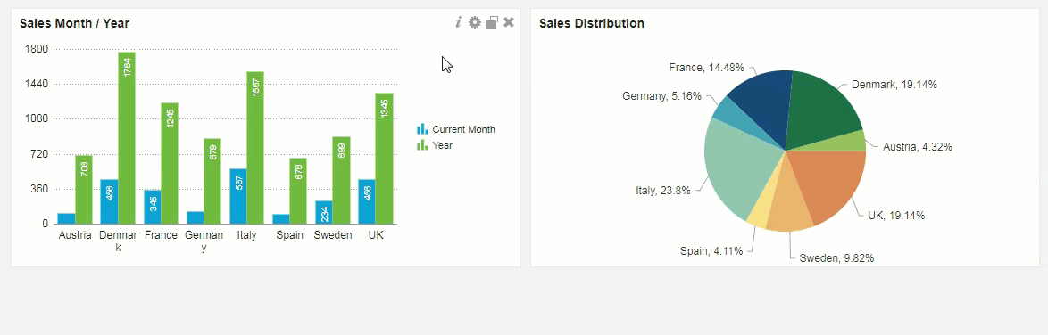The following chart view shows the use of the Dynamic Filter. By clicking on the chart, the filter panel slides-out to the right. The user can select the Dynamic Filter (Country), select an operator, and one or more country from the displayed list. This particular example displays a global (top level) chart view of show sales per country. When the Dynamic Filter is applied the user can drill-down to a specific country and city view.