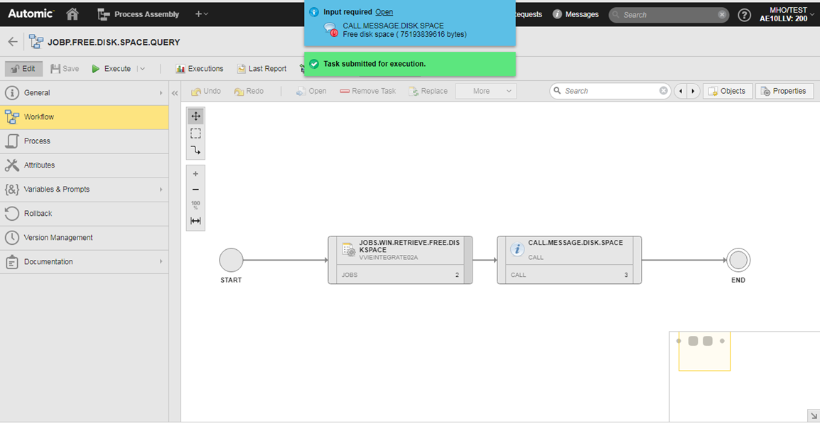 - A green pop up message at the top of the screen indicates that the Workflow has started executing. The message provides a link to the Workflow monitor.