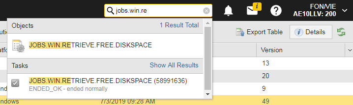 To insert the Job, start typing its name in the Search field. The Global Search opens a drop down list with a selection of the results of the search. This is what it looks like: