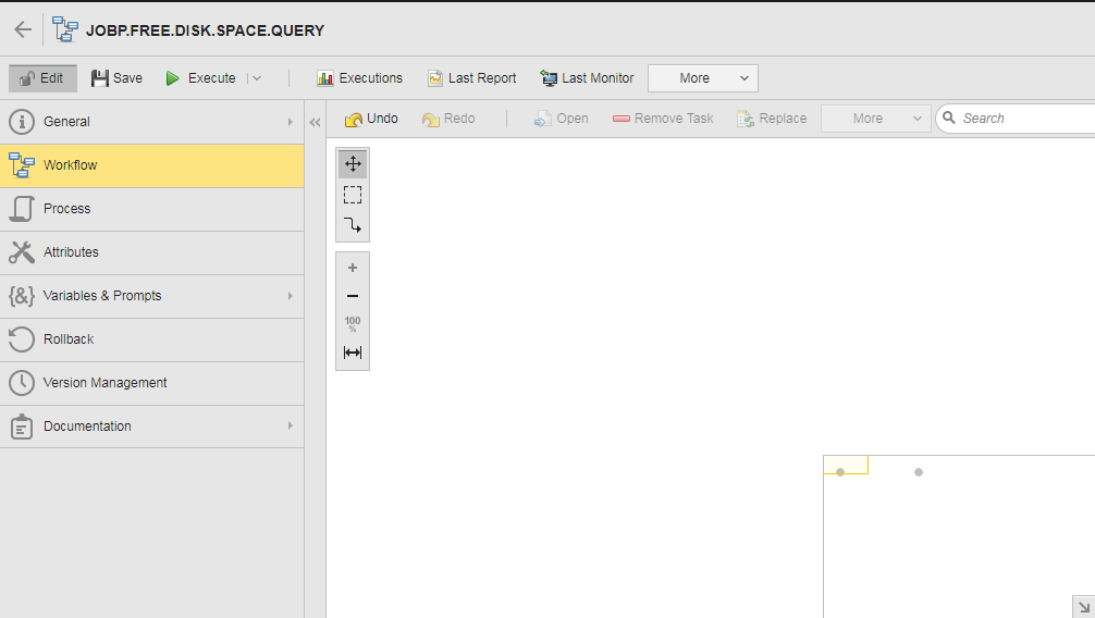The Workflow editor is the canvas that you see when you open the Workflow page after creating a Workflow object. The editor contains graphic tools to insert, connect, move and work with the tasks in the Workflow. For more information, see Designing Workflows in the Editor.