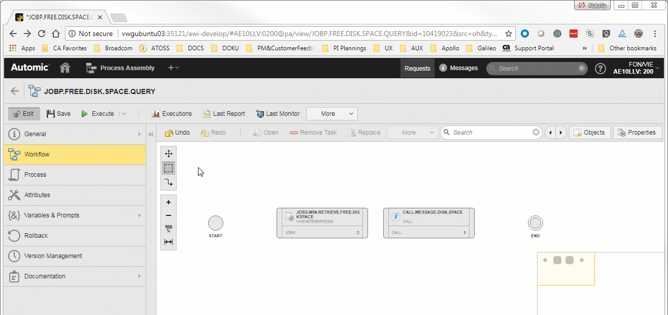 After you have connected the tasks, you have a functioning Workflow. Notice that if you hover your mouse over the task boxes, or over the START and END nodes, a tooltip shows relevant configuration data about the task. For more information, see Task Boxes in Workflows.