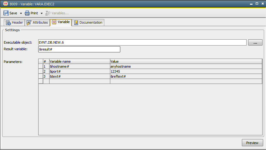 | Preview | This retrieves the variable values, executes the specified operation, and displays the result in a new window. |