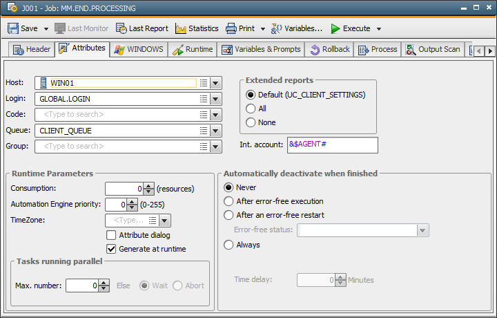 The job is automatically deactivated when a restart has been successfully executed. Previously interrupted jobs are also deactivated. You can also set a status for the error-free execution and a time delay for de-activation. Do so by specifying the fields Error-free status and/or Time delay ... Minutes . If this value is set also via the UC_CLIENT_SETTINGS, the setting in this field will be considered according to the following rules: