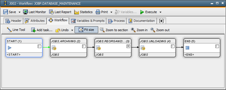The script starts a workflow which carries out the actual maintaining procedure with the script function ACTIVATE_UC_OBJECT. Remember to query beforehand if the value "N" was selected for all options (archiving, reorganizing, unloading). In this case, the workflow would not start at all.