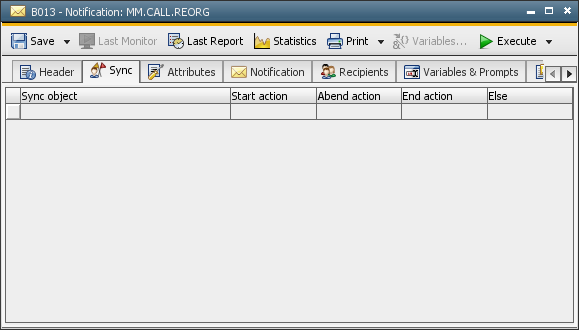 Sync objects synchronize tasks on the basis of defined conditions. To use this function, you enter one or several Sync objects including the actions that should be included in this tab.