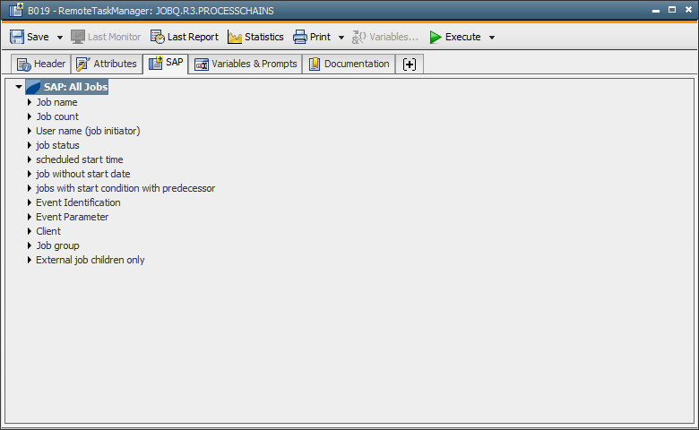In RemoteTaskManager objects for process chains, the options Filtering and Start jobs(Attributes tab) are disabled because they are useless here.
