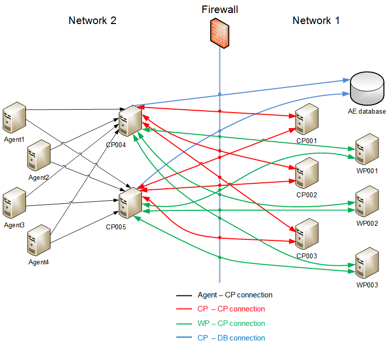 Note that Automic recommends running CPs and WPs in the same secure network zone. Should the CPs be located in different network zones, separated by a firewall, please observe and configure the necessary firewall exceptions. To enable CP selection, agents will be presented with a complete CP list as soon as they connect to the Automation Engine. Should some of the CPs be placed behind a firewall – from the agent's point of view – the connections of the agents to the CPs have to be configured in the firewall itself.