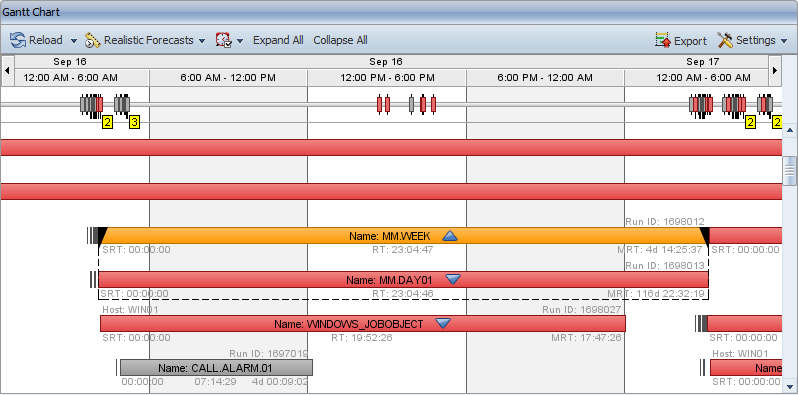 Bars of activities that should have finished end at the ETL indicator (time of the last ETL process). These tasks show the current runtime (CRT) instead of the expected runtime (ERT).