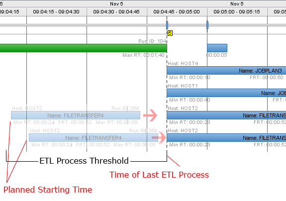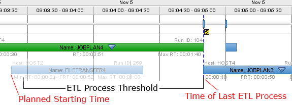 The difference between the scheduled start time and the new ETL process is still smaller than the specified threshold value. Therefore, the task is still displayed and positioned in accordance with the ETL indicator.