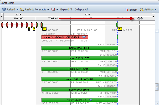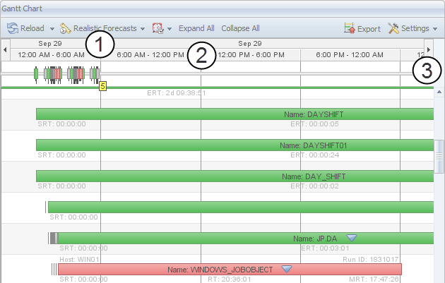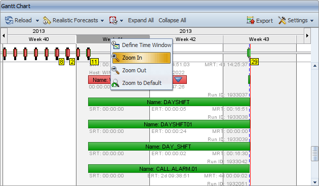 For example, double-clicking the time period 12:00 - 0:00 has the effect that the Gantt Chart only displays the data from 12 to 0 o'clock. The new time periods now have a length of one hour each.