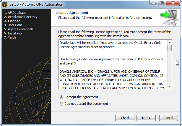 You will be asked to confirm the license information pertaining to the external software (e.g. Oracle Java) that will be installed.