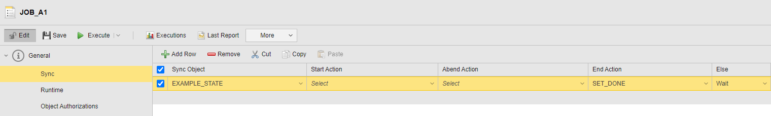 In our example, we assign the Sync object to a Job. When processing this Job, access to the database should be possible for other tasks, so we will choose the USE action: