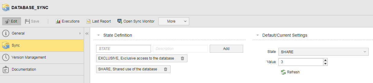 This action can be triggered when the Sync object is in SHARE status with value zero. This action is only possible if no other task uses the database.