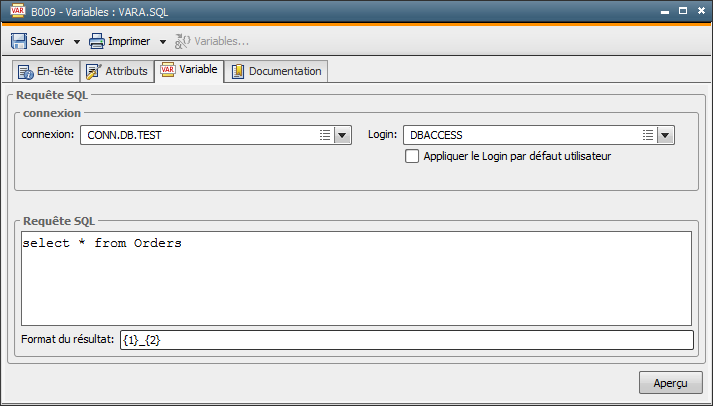 Si une variable a une source SQL - interne, les valeurs sont récupérées à partir de la base de données AE au moyen d'instructions SQL. Il n'est pas nécessaire d'indiquer de connexion ni de Login car l'accès à la base de données reste interne.