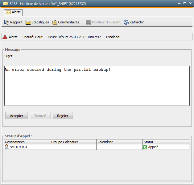 Dès qu'un utilisateur accepte la notification, elle reste visible pour les autres utilisateurs désignés en tant qu'opérateurs. Les boutons sont toutefois désactivés pour ces utilisateurs. L'utilisateur peut exécuter ce qui est requis par la notification puis l'acquitter avec "Terminé" ou la rejeter..  S'il la rejète, les boutons sont de nouveau activés pour qu'un autre utilisateur puisse accepter la notification.