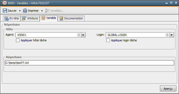 | Login | Objet Login pour la connexion à l'hôte. En l'absence de cette indication, le système utilise automatiquement l'objet Login de la tâche qui accède aux variables. |