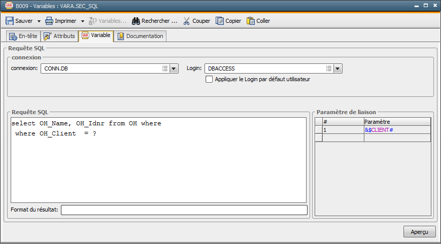 Vous ne pouvez pas spécifier de variables directement dans le champ Requête SQL, mais vous pouvez les inclure dans des paramètres de liaison. Ces paramètres de liaison sont gérés dans les tables correspondantes et peuvent contenir des variables prédéfinies, des caractères de remplacement pour les objets VARA et des variables PromptSet. Dans le script SQL, utilisez le caractère ? à l'emplacement où les paramètres de liaison doivent être insérés.