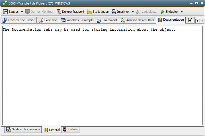 Tous les onglets de documentation qui ont été définis par l'administrateur dans la variable UC_OBJECT_DOCU sont affichés. Notez que les objets importés ont leurs propres onglets de documentation.