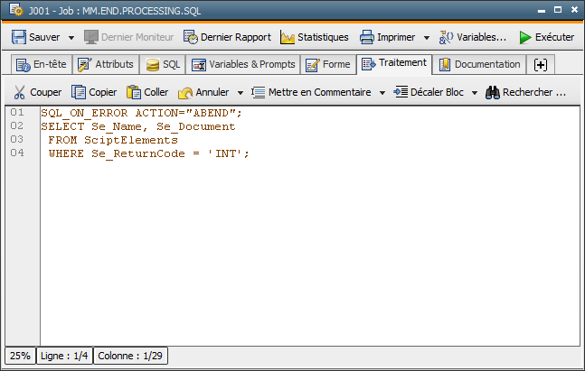Chaque commande est terminée par un point-virgule par défaut. Si vous utilisez ce caractère à l'intérieur d'une commande SQL, un nouveau caractère de séparation est défini : le Job insère automatiquement la commande SQL_SET_STATEMENT_TERMINATOR dans le script.