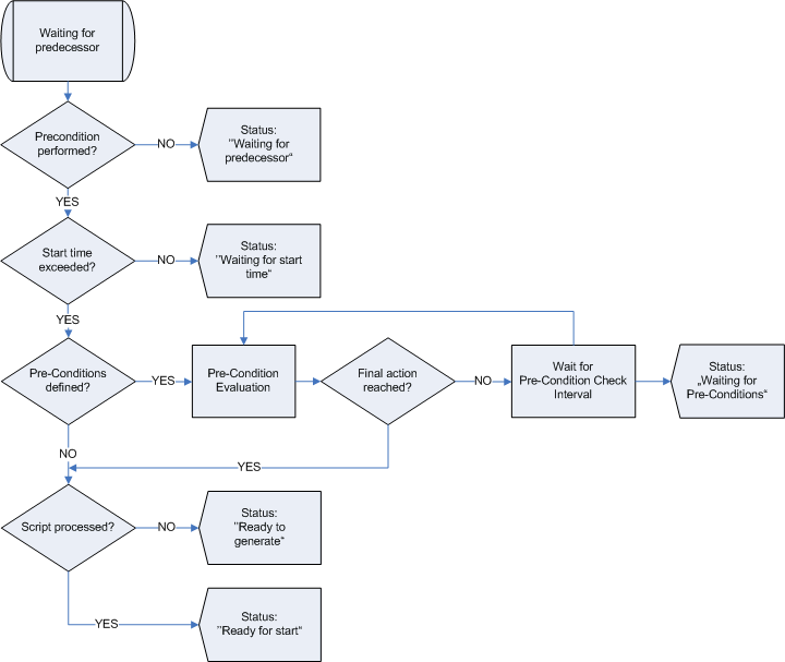 La structure et le point de départ de la phase de génération dépendent du paramètre Générer à l'Exécution que contient chaque objet activable dans l'onglet Attributs. Cette phase influence l'exécution du script : soit immédiatement après l'activation ou seulement directement avant le démarrage de la phase de traitement de la Tâche.