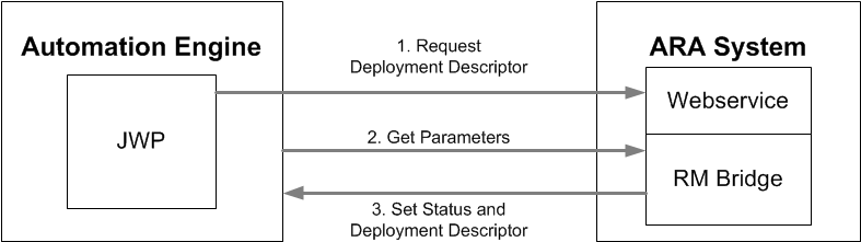 Lorsqu'un workflow configuré comme workflow de déploiement via l'onglet Déploiement est activé, Automation Engine envoie une requête à l'instance ARA (1). Plus précisément, la requête s'adresse au descripteur de déploiement, un kit contenant tous les paramètres requis pour exécuter le workflow de déploiement. L'étape suivante (2) consiste à transmettre à ARA les paramètres généraux de Automation Engine (RunID du workflow, contenu de l'onglet Déploiement, tel que le nom du workflow et de l'application), requis pour la requête.