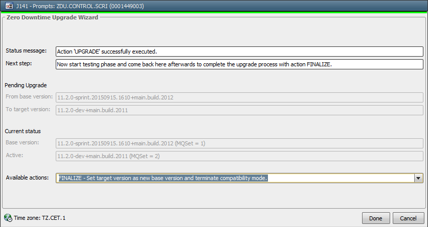 Mode de compatibilité : Ce mode est activé aussi tôt que vous sélectionnez l'option BEGIN dans l'assistant ZDU. Dans ce mode, qui est activé jusqu'à ce que vous choisissiez l'option FINALIZE, certaines fonctions d'optimisation du système ne sont pas disponibles. La performance du système sera réduite sensiblement.