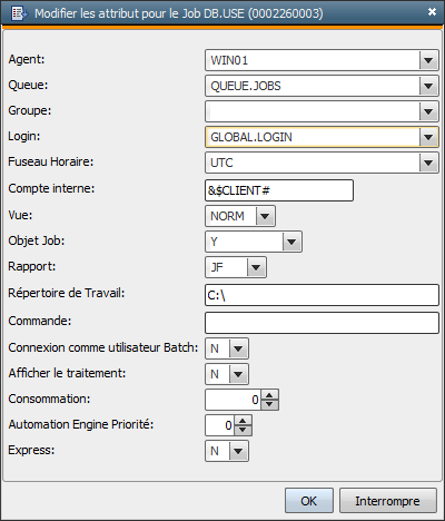 Une fois l'objet démarré, une fenêtre de saisie apparaît pour vous permettre de configurer tous les attributs. L'exemple ici montre une fenêtre de Job Windows :