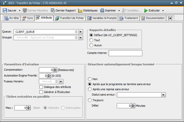 L'onglet Attributs est un onglet spécifique à un type d'objet et on ne peut le trouver sous cet aspect que pour l'objet transfert de fichier. Tous les paramètres pour l'exécution du transfert de fichier sont définis dans cet onglet.