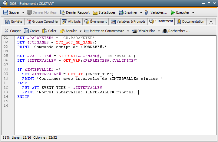 Onglet ! Script| L'onglet ! Script est un onglet spécifique à un type d'objet, dans lequel des instructions de traitement dans le langage de Traitement de l'Automation Engine sont consignées. Il n'apparaît que dans le type d'objet "Evènement". Les instructions de ce script sont traitées/exécutées au moment où l'Evènement se produit. |