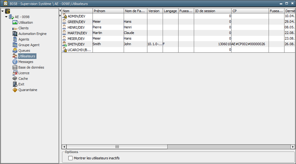 UtilisateursTous les utilisateurs du client sont listés dans la catégorie utilisateur. Tous les utilisateurs du système AE peuvent être affichés dans le client système 0000. On peut afficher des informations plus précises à côté des données de l'aperçu, grâce à la commande Détails du menu contextuel. Ce menu permet également d'interrompre une session utilisateur. La connexion est interrompue immédiatement et un message informe l'utilisateur si le fonctionnement de l'interface utilisateur est repris.