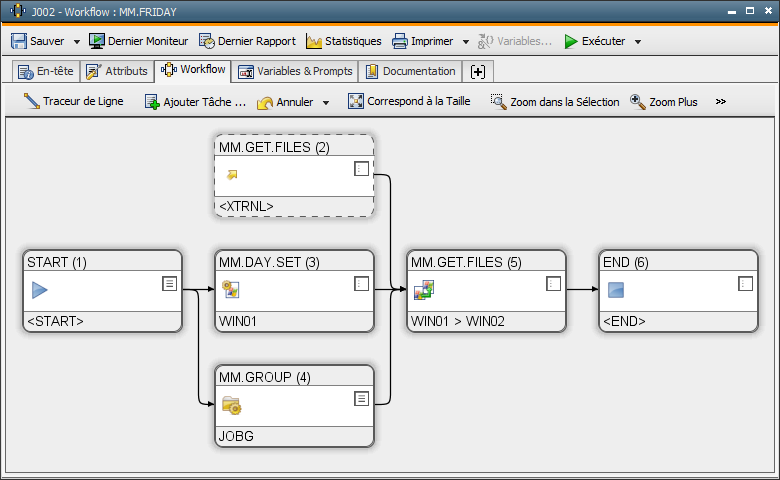 Les tâches du Workflow se référant aux dépendances externes (dans l'exemple ci-dessus, le job "MM.END.PROCESSING") peuvent réagir à un statut via l'onglet Dépendances. Il ne s'agit cependant pas du statut de la tâche externe mais du statut de la dépendance externe. C'est pour cette raison que seuls les statuts suivants peuvent être choisis :