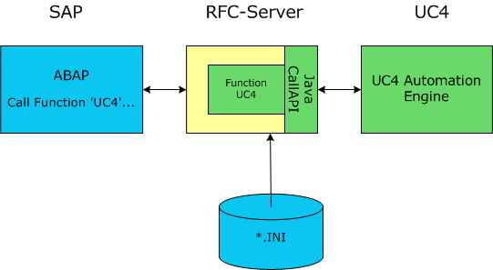 CallAPI pour UNIX est fourni avec l'Automation Engine. Cela permet d'exécuter un script AE directement depuis des programmes ABAP. CallAPI est représenté au moyen d'un Serveur RFC contenant la composante de base de la fonction "UC4". Cette composante de base de la fonction peut être exécutée directement depuis ABAP.