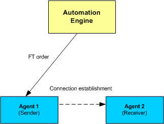 L'Agent expéditeur essaie de mettre en place une connexion vers le destinataire. Si cela ne peut avoir lieu en raison, par exemple, du pare-feu, il en informe l'Automation Engine. L'ordre TF est envoyé au destinataire qui peut alors tenter d'établir une connexion vers l'expéditeur. Suite à une connexion réussie, l'Agent destinataire transfère l'ordre TF à l'expéditeur.