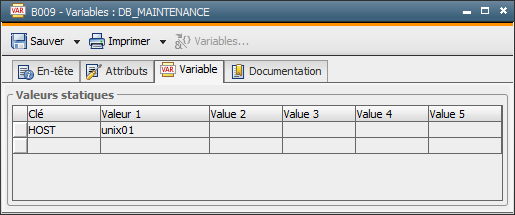 Dans l'illustration suivante, vous pouvez voir un objet Variable statique. Il contient déjà une Variable nommée "HOTE" avec la valeur "unix01".