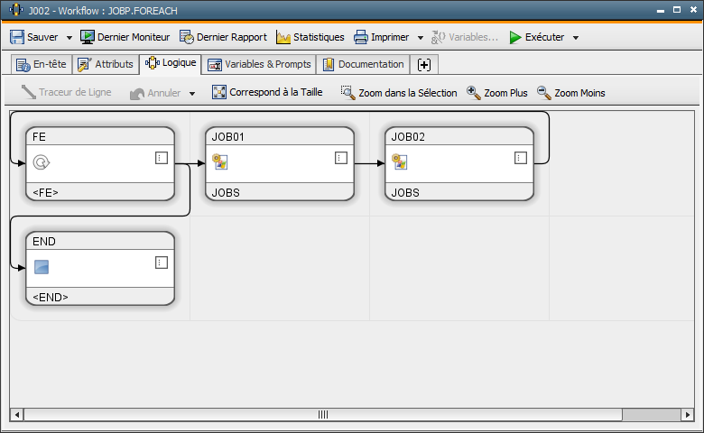 L'onglet Logique propre à l'objet est disponible uniquement pour les workflows de type IF et FOREACH et sa structure varie en fonction du type. Il permet de définir les Workflows, les dépendances et les propriétés de leurs tâches subordonnées. La structure spécifique de l'onglet Logique pour le type de workflow ForEach et les autres particularités des workflows ForEach sont décrites ci-dessous.