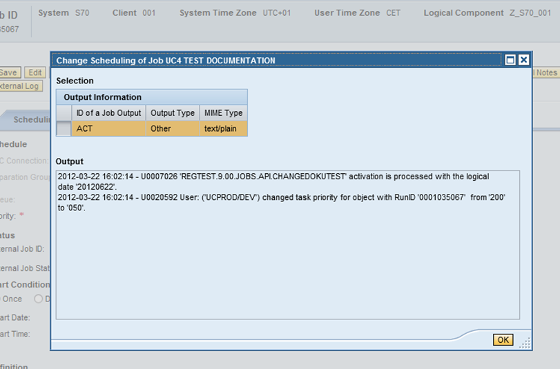 - Le bouton "Schedule/Change Externally" vous permet de planifier ensuite la tâche dans l'Automation Engine. Le RunID de la tâche activée s'affiche ensuite comme message de retour dans la zone supérieure.