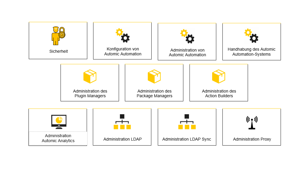 Klicken Sie auf die folgenden Bilder, um mehr über Sicherheit zu erfahren und wie man Automic Automation und die damit verbundenen Komponenten verwaltet und konfiguriert.