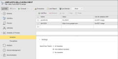 Die Variablen, die Sie in einem Workflow definieren, können den Aufgaben übergeben werden, die im Workflow ausgeführt werden. In unserem HELLO WORLD-Workflow ist Von übergeordnetem Element erben auf Nur definierte Variablen gesetzt. Das bedeutet, dass die in der Tabelle definierten Variablen den Workflow-Aufgaben übergeben werden.