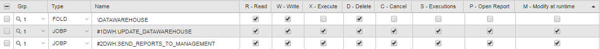 Erteilen Sie JOHN R-, W- und D-Rechte auf den Ordner DATAWAREHOUSE (FOLD) sowie volle Rechte auf zwei spezifische Workflows (JOBP), die im Ordner DATAWAREHOUSE gespeichert sind.