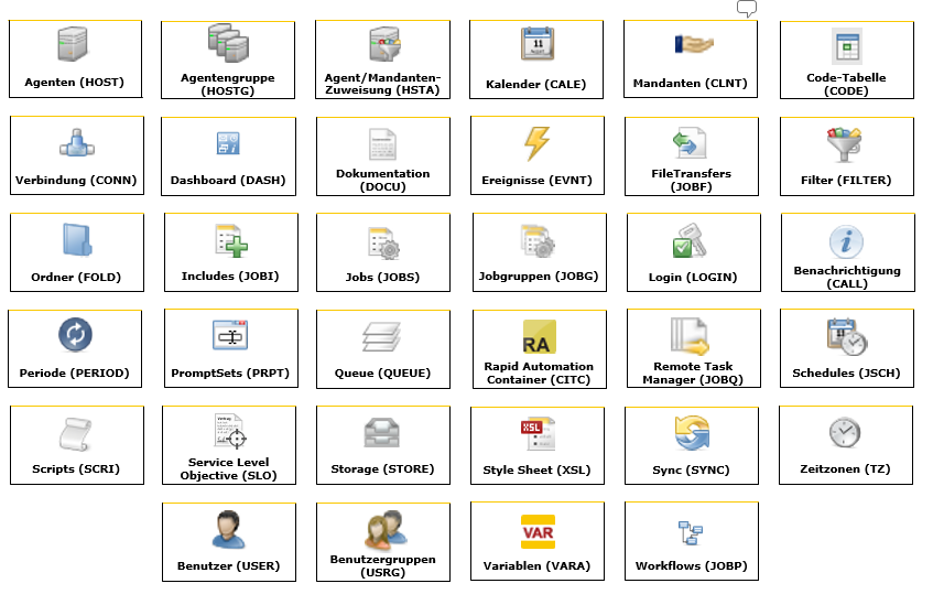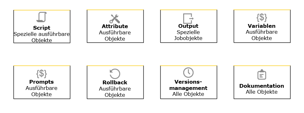 Automic Automation-Objekte bestehen aus mehreren Definitionsseiten. Als Entwickler und Objektdesigner beginnen Sie nach dem Hinzufügen eines Objekts mit der Konfiguration, indem Sie die entsprechenden Attribute auf seinen Definitionsseiten definieren. Einige dieser Seiten sind Standard und für alle Objekttypen verfügbar. Andere sind nur für bestimmte Objekttypen verfügbar. Im folgenden Thema sind Links zu den Beschreibungen dieser Seiten angegeben. Klicken Sie auf die Felder unten, um auf sie zuzugreifen.