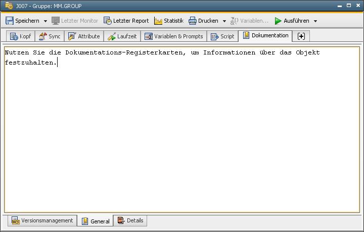 Es werden alle Dokumentations-Registerkarten angezeigt, die der Administrator in der Variable UC_OBJECT_DOCU eingetragen hat. Davon unabhängig weisen importierte Objekte zusätzlich ihre eigenen Dokumentations-Registerkarten auf.