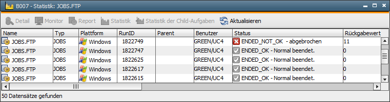 Wird eine Fehlermeldung im Report gefunden (z.B. File not found), so können Sie darauf reagieren, indem Sie mittels MODIFY_STATE den Statustext festlegen, der im Detailfenster des Statistiksatzes angezeigt wird, und auch den Rückgabewert des Jobs ändern (beeinflusst den Endestatus).