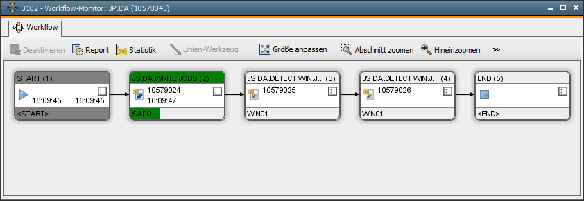 Nach der Auswahl bzw. Vorgabe des Archivierungsobjektes wird der Workflow automatisch gestartet und im Monitor angezeigt. Er endet erst, wenn alle Verarbeitungsschritte erfolgreich beendet sind.