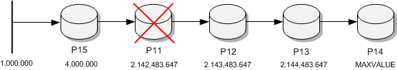 Anschließend wird die älteste Partition P12 gelöscht, wodurch P15 automatisch deren Obergrenze bekommt. P15 reicht nun technisch von 1.000.000 bis 2.143.483.647.
