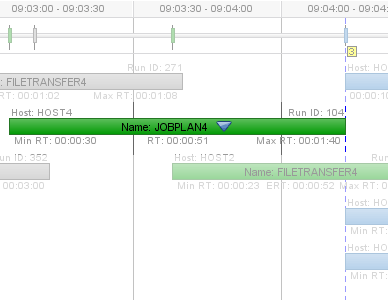 Balken von Aktivitäten, die eigentlich schon abgeschlossen sein müssten, enden beim ETL-Indikator (Zeitpunkt des letzten ETL-Prozesses). Für solche Aufgaben wird anstatt der voraussichtlichen Laufzeit (ERT) die aktuelle Laufzeit (CRT) angegeben.
