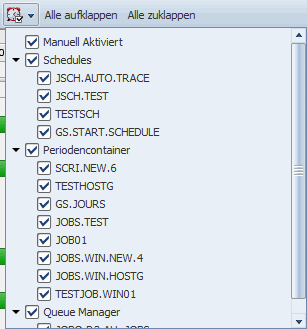 Beim Klick auf das Schedule-Symbol in der Symbolleiste wird ein DropDown-Menü geöffnet, welches alle lang laufenden Aufgaben (geordnet nach Typ) auflistet. Über dieses Menü können Sie gezielt jene langlaufenden Instanzen bestimmen, deren Child-Aufgaben im Gantt-Diagramm eingeblendet werden sollen. Dies betrifft auch Prognosedaten.