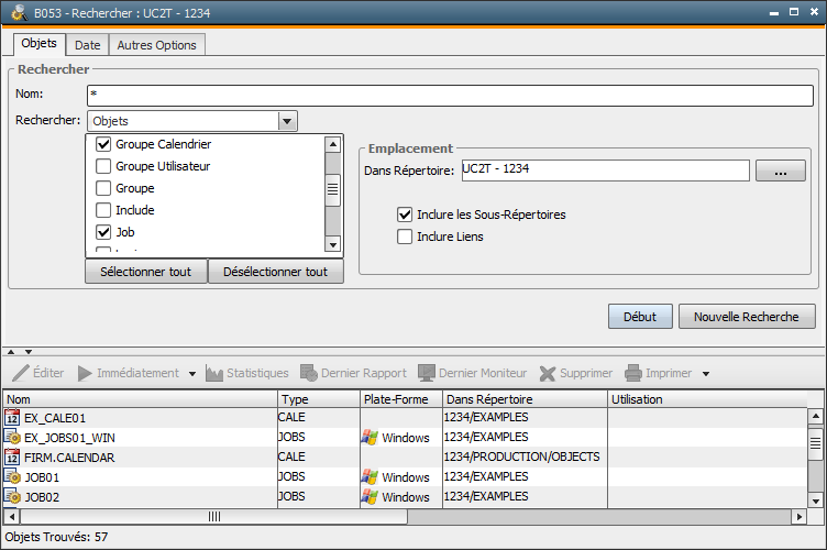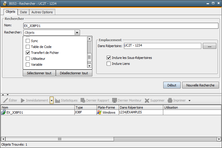 Le type de recherche (porte sur des objets ou sur des utilisations d'objets) dépend de l'option choisie dans le paramètre Rechercher dans l'onglet "Objets".