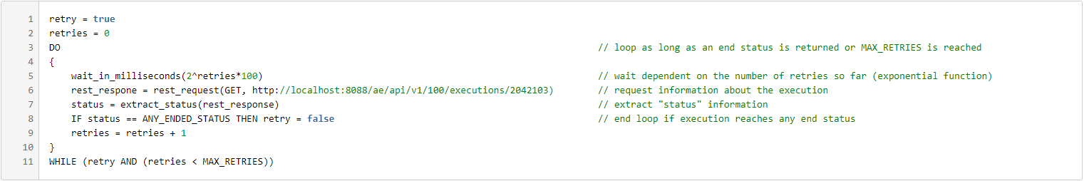 The following sample shows how polling for execution status can be done through the AE REST API: