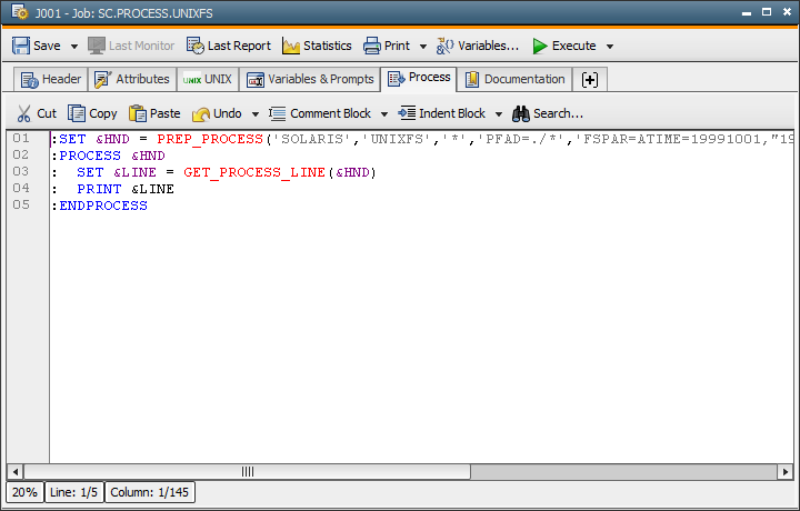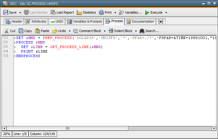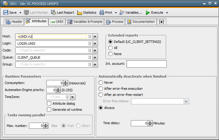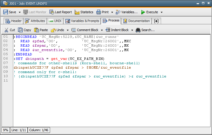 At the start of the job EVENT.UNIXFS, the script variables &PATH and &FSPAR are supplied with values. These values are defined in the parameters of the script function PREP_PROCESS of the job SC.PROCESS.UNIXFS. The AE utility is called with these specifications. It retrieves the requested information on the Unix file system. It is not necessary to replace the question marks in the program name. The utility can be called in this way after a correct installation.