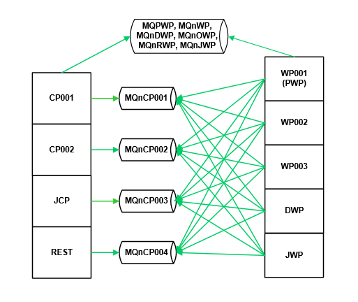Each communication process (JCP/CP) as well as the REST process within an AE system have their own communication queue which processes the tasks in the queue. The work processes (WPs) store all external tasks for the agents and Automic Web Interface instances in this queue.